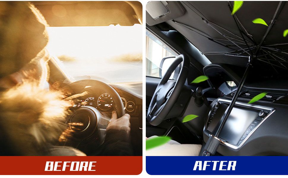 [Heat insulation and sun protection]:This Foldable Front Window Sunshade Umbrella blocks UV rays and keeps the car at a cool temperature. It also protects car dashboards and interiors from fading due to exposure.